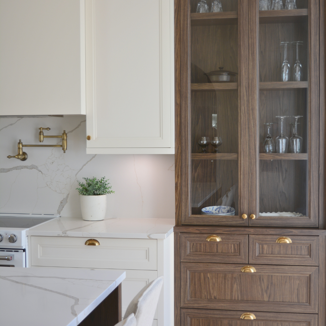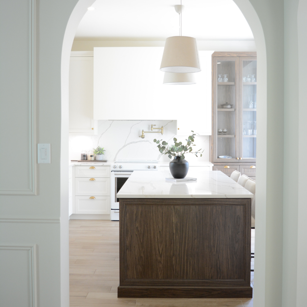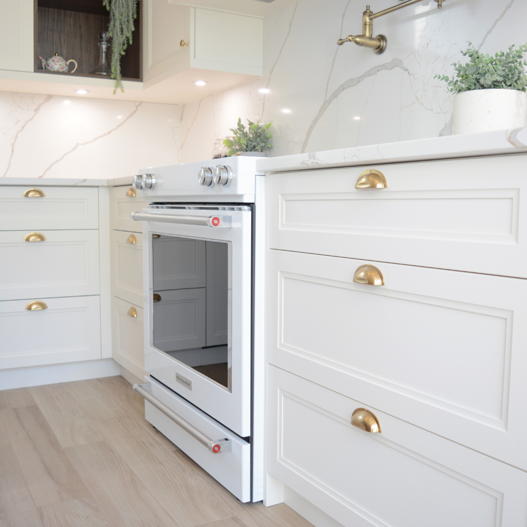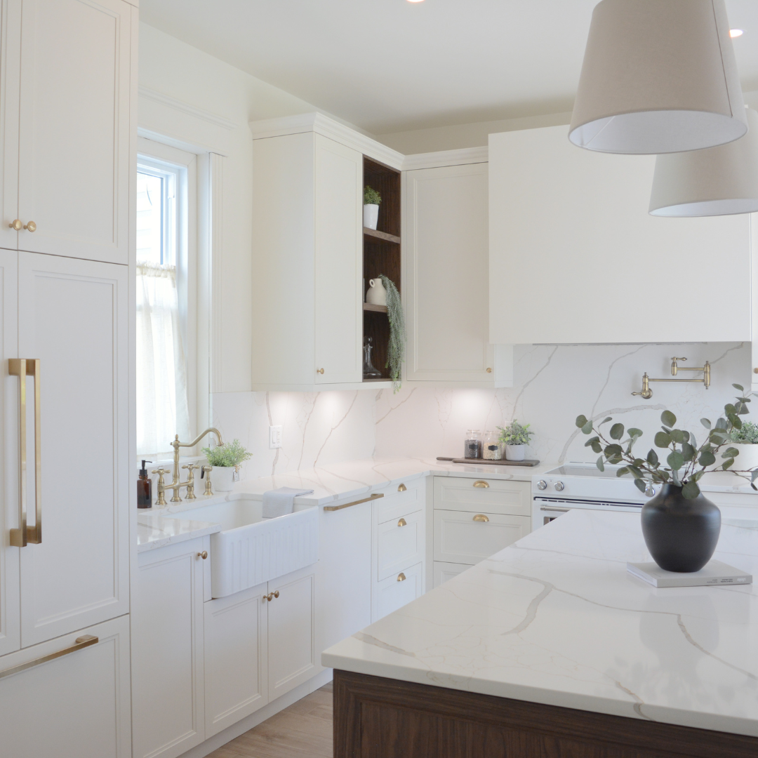 Cette cuisine incarne parfaitement l’équilibre entre modernité et raffinement intemporel. Les armoires blanches au fini mat, rehaussées de poignées dorées, apportent une touche de chaleur et de sophistication à l’ensemble. Le dosseret effet marbre, avec ses veinures marquantes, ajoute une dimension luxueuse tout en conservant une grande douceur visuelle.